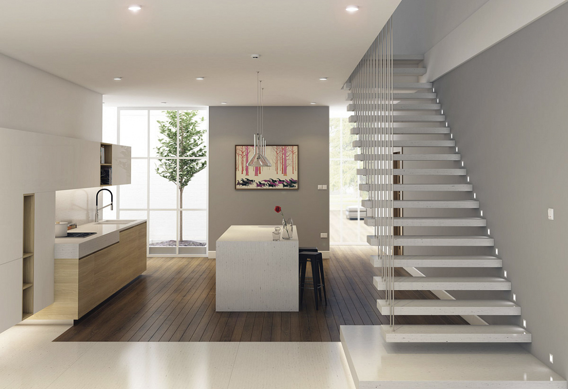 Их можно удачно комбинировать с деревом, металлом или стеклом, а разнообразие фактур – от мраморных до гранитных – дает возможность создать как элегантный, так и тёплый домашний образ. К тому же искусственный камень практически не требует сложного ухода и долго сохраняет презентабельный вид, что делает его отличным вариантом для оформления лестниц и подиумов в загородном интерьере.